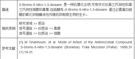 5-溴-5-硝基-1,3-二恶烷是一种化学物质,化学式是C₄H₆BrNO₄,分子量为212.00。其他名称M-DIOXANE,5-BROMO-5-NITRO-(8CI);安全信息安全说明S36:穿戴合适的防护服装。危险品标志Xn:有害物质危险类别码R22:吞咽有害。R38:刺激皮肤。